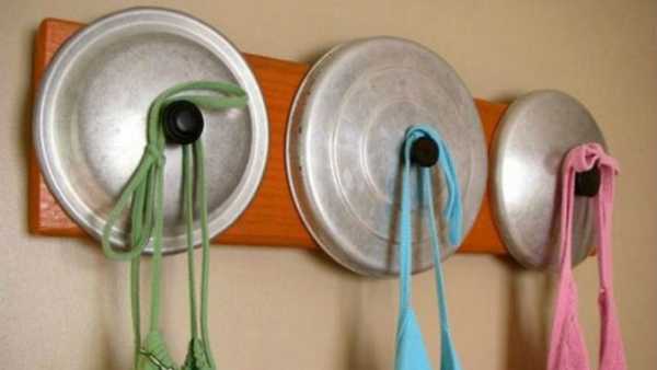 Крючки, а точнее, держатели для кухни легко изготовить из крышек от кастрюль. Если таких скопилось несколько, то нужно задекорировать их и просверлить в них отверстия в одной из половин крышки. После этого крышки приклеить к выбранной основе, отверстиями вверх. Теперь в них можно вставлять разные кухонные принадлежности, такие как ножи, деревянные ложки для помешивания и др.