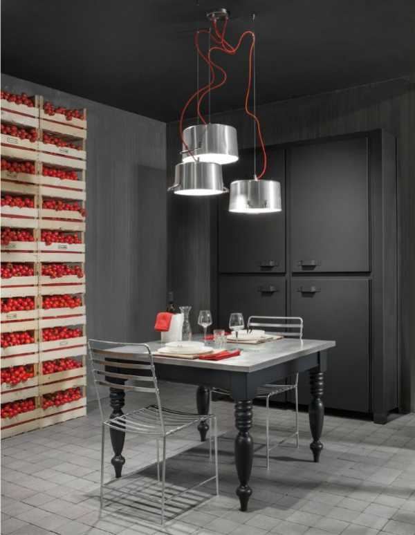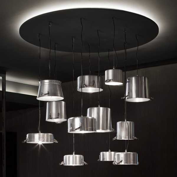 - Из небольших кастрюлек можно сделать не одну люстру, а целый комплекс потолочных люстр, подвешенных на шнурах, на разной высоте. Чтобы идея выглядела ещё более оригинально, можно сделать кастрюли разными по глубине. Для этого нужно будет только срезать болгаркой часть боковой поверхности. Так получим плафоны-кастрюли более глубокие и более мелкие.
