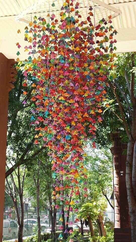Те же самые цветы из выпуклых частей яичных коробочек можно подвесить в виде гирлянд на толстые нити. Чтобы цветы не скользили по нити, зафиксируйте их внутри каждого цветка маленькими пуговичками.Крокодил