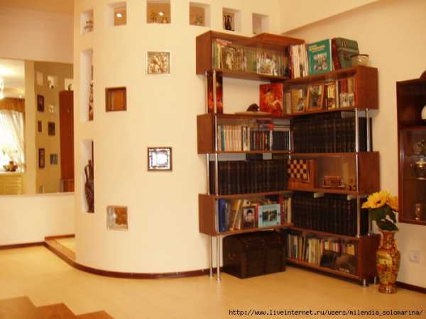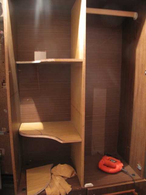 Затем в одной половине шкафа приспособила перекладину для плечиков, а в другой-навыпиливала фигурные полочки для всяких нужностей