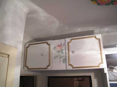 Дверцы красятся в тот же цвет. Можно использовать узоры со старого шкафа. Только обязательно обработайте их золотой краской.