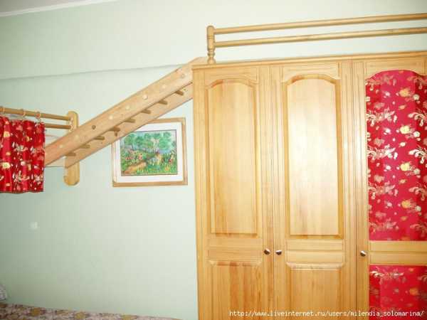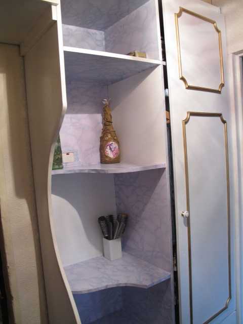 А это в той же квартире я сделала перелаз на шкаф с двух-уровневой кровати, шкаф декорировала просто убрав стекло, и сделав обивку шёлком по паралону в тон занавески кровати
