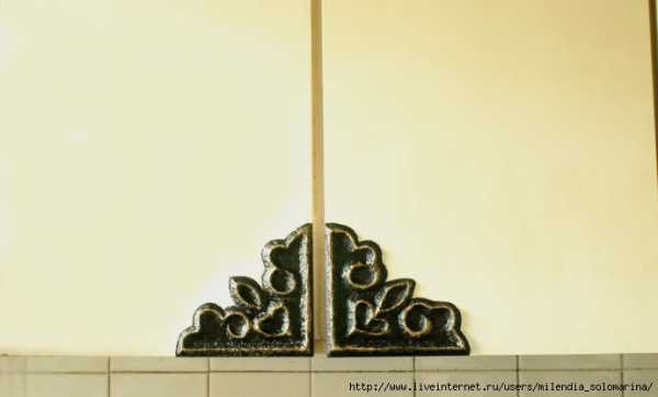 То достаточно сделать бордюр внизу шкафчиков и уголки на навесных шкафчиках в тон.