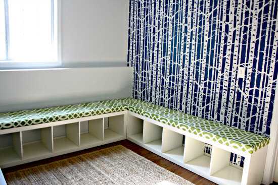 Снять полки и соединить между собой, чтобы получился квадрат. На верхнюю часть положить по размеру поролон и обшить тканью. Стенки пуфика можно покрасить в любой подходящий цвет.