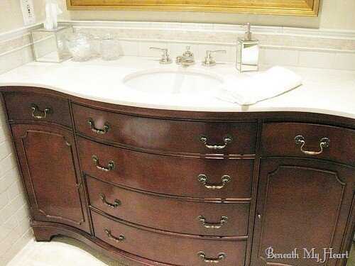 - Сделать обыкновенную прямоугольную тумбочку и к задней части прикрутить с двух сторон лёгкую заднюю половинку от шкафа. А для большей красоты добавить зеркало с держателями по краям контура.