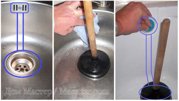 Для ванны подойдет специальная заглушка, идущая в комплекте с сифоном, а для раковины достаточно закрыть перелив мокрой тряпкой. Все, теперь вантуз готов справиться с засором!