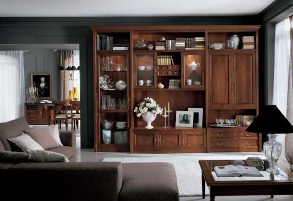- Традиционная стенка состоит из шкафов для одежды и книг, антресолей, бара и места для телевизора. Обычно она имеет высоту от пола до потолка и занимает всю или большую часть стены. Такая мебель имеет достаточно сдержанный внешний вид, она будет отлично смотреться в классических и английских стилях, а также в интерьерах с африканскими мотивами.