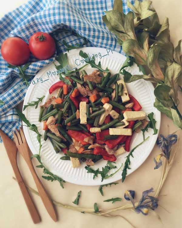 - Отправьте мясо с овощами на сковородку, добавив туда фасоль стручковую, тофу. Посолите и поперчите продукты по вкусу.