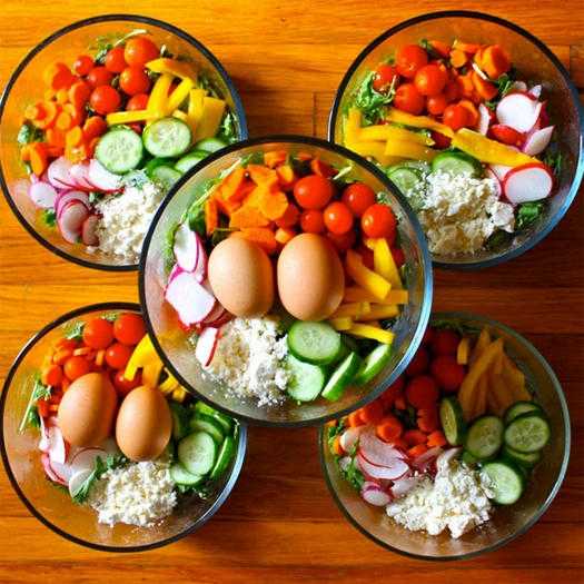Приготовить нескучный обед на целую неделю нам предлагает Кирстен @orangesandavocados, которая делает салат из редиса, помидора, сыра фета и сваренного вкрутую яйца. Все ингредиенты она складывает в пиалы, чтобы потом ей нужно было всего лишь приправить салат маслом.