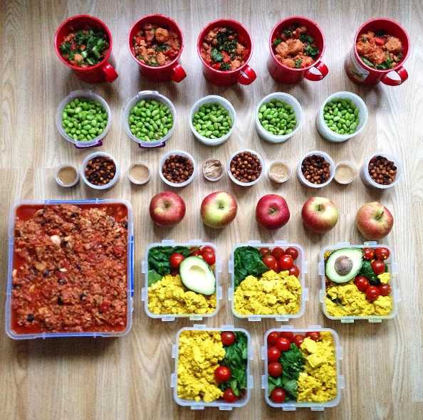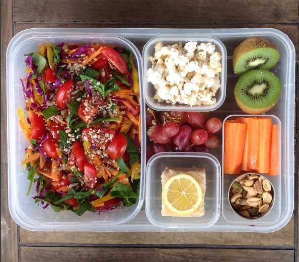 @lifeofavegetarian упаковывает обеды как профи: она складывает все маленькие контейнеры в один большой судок для ланча. Фото –пример обеда для одного рабочего дня. Здесь есть салат из шпината, красной капусты, паприки, моркови, помидоров, семян и орехов. В мини-контейнерах виднеется лимон и кусочек тахини – молотых кунжутных семян, виноград, морковные палочки, соленые орехи и даже попкорн.