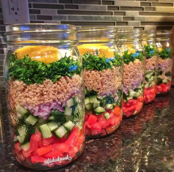 А Тина @fitchickscook готовит себе обеды и ужины в банке! Она складывает свежие овощи на дно, а крупы и зелень – ближе к поверхности банки. Почему банки? Дело, в том что они лучше сохраняют продукты свежими из-за плотной крышки. К тому же, их легко чистить, а замена банки существенно не повлияет на ваш бюджет.