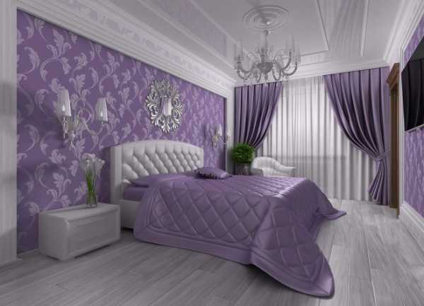 При использовании сиреневого цвета для спальни в качестве фона необязательно оклеивать все стены одинаковыми обоями – у дверей, в нишах можно использовать полотна темнее, а за кроватью оформить красивую узорчатую поверхность или применить фотообои, чтобы не перенасытить апартаменты фиолетовым. Красиво будет выглядеть лиловая комната, дополненная текстилем на мебели и шторах с белым или золотистым орнаментом.