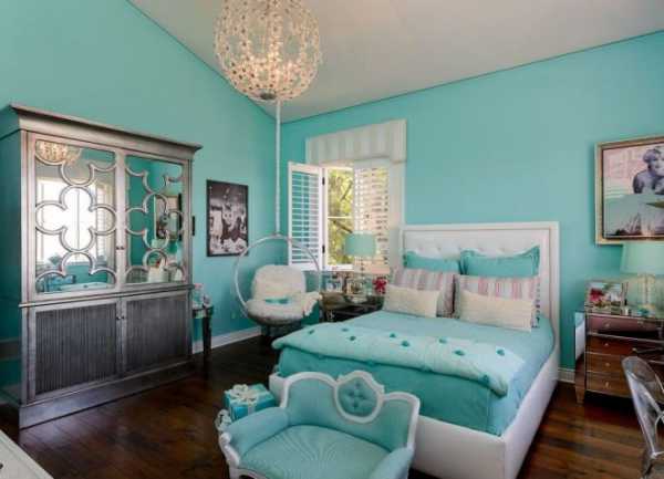 Решая, как выбрать цвет для спальни, можно становиться на бирюзе. Она является производной от голубого и зеленого колера. Яркие бирюзовые цвета для спальни ассоциируются с морем, отдыхом на лазурном побережье, подходят тем, кто хочет создать в помещении атмосферу релакса. Такую гамму не используют для создания монохромных интерьеров, ее обязательно дополняют другими оттенками.
