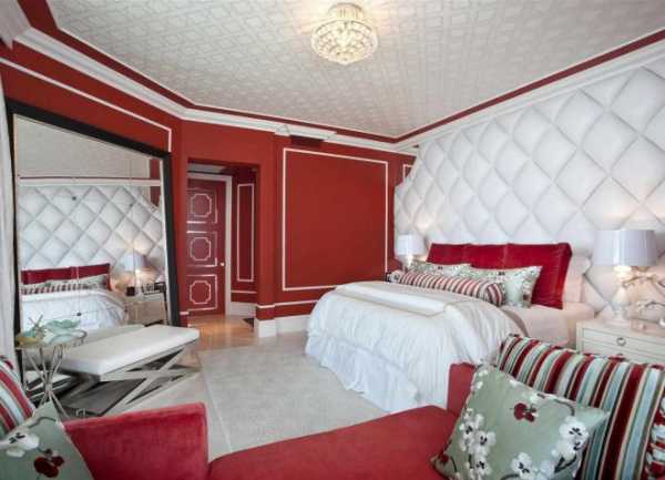 Если используется красный фон стен, то лучше применить более приглушенный оттенок – бордовый, кирпичный. Еще один вариант – окрашивание только одной поверхности в яркий тон, как правило, это участок у изголовья кровати. Однотонность интерьера необязательна, в нем красиво смотрятся стены и текстиль с узорами и орнаментами. Красно-черный дизайн подходит горячим и очень активным натурам.