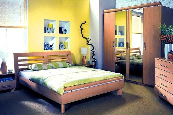 Рекомендуемые яркие цвета для спальни – это светло-желтый, синий, салатовый, пастельные розовый, голубой. Пол лучше выбрать в цвете бук или темного дерева.
