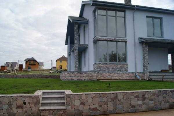 Серые окна (Renolit 715505) выбрали из-за цвета облицовочного камня, а фасад покрасили чуть светлее.