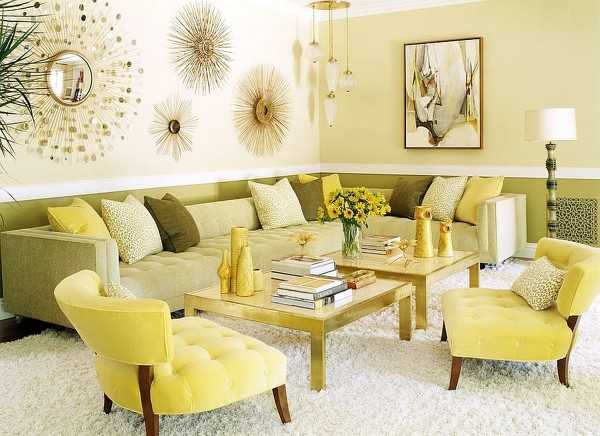 - Гостиная довольно часто собирает большое количество совершенно разных по характеру и возрасту людей, поэтому при ее оформлении можно экспериментировать и использовать всю свою фантазию. Однако наиболее приемлемым считается желтый цвет.