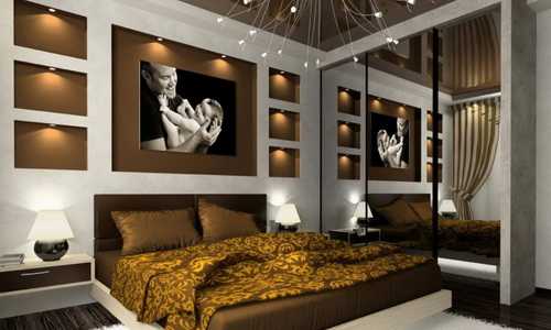 Интересное дизайнерское решение — отделка широкой стены обоями с таким необычным рисункомВыбор цвета для спальни следует особого подхода, ведь это, в первую очередь, место для отдыха — помните об этом. Романтические тона в спальне только приветствуются.