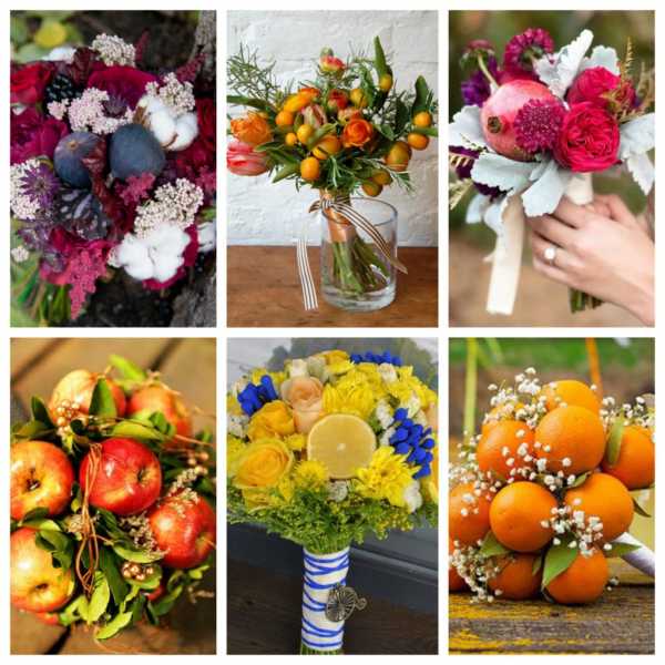 Флористы при составлении букетов используют разнообразные местные и экзотические фрукты. Интересно смотрятся цветочные композиции с гранатом, инжиром и бергамотом. Фото растений отображают как гармонично смотрятся их плоды в букете.