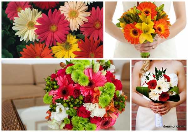 Гербера. Солнечная гербера придаст яркость любому букету. Цветы похожи на разноцветные ромашки и символизируют радость жизни. Герберы хорошо сочетаются с ирисами и орхидеями.