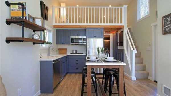 Внизу кухня открытой планировки соединена с гостиной. Эта небольшая комната вполне удобна для отдыха и вмещает в себя диван и кресло. Кроме того, на кухонном острове с задней стенки предусмотрен откидной обеденный стол.