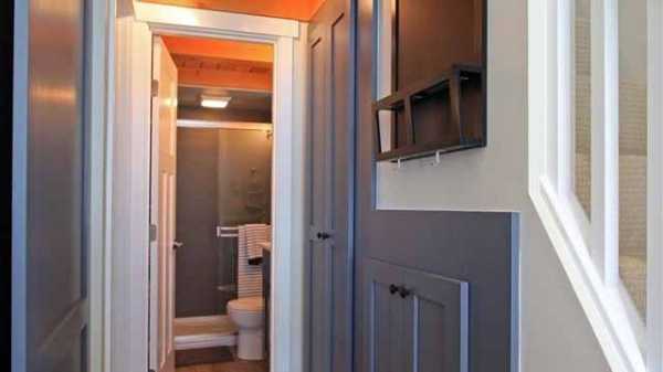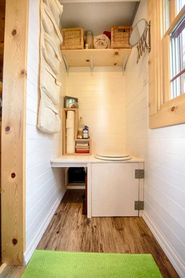 С одной стороны спальное место расположено над ванной. Лестница вверх удачно совмещена со стеллажом для кухни.