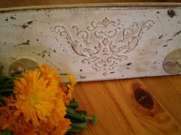 Декор комода в этом стиле начинается съемом фурнитуры и вытягиванием всех ящиков. Трафареты крепятся на поверхности и покрываются шпатлевкой. Подровняйте шпателем и оставьте сохнуть объемный узор. Можно сделать мебель однотонной или выделить созданные элементы. Если это выделение, просто натрите выпуклые части воском по аналогии с предыдущим способом, а после покрытия краской сотрите ее на восковых участках. Это хороший способ восстановить старый или придать особый шарм новому комоду.