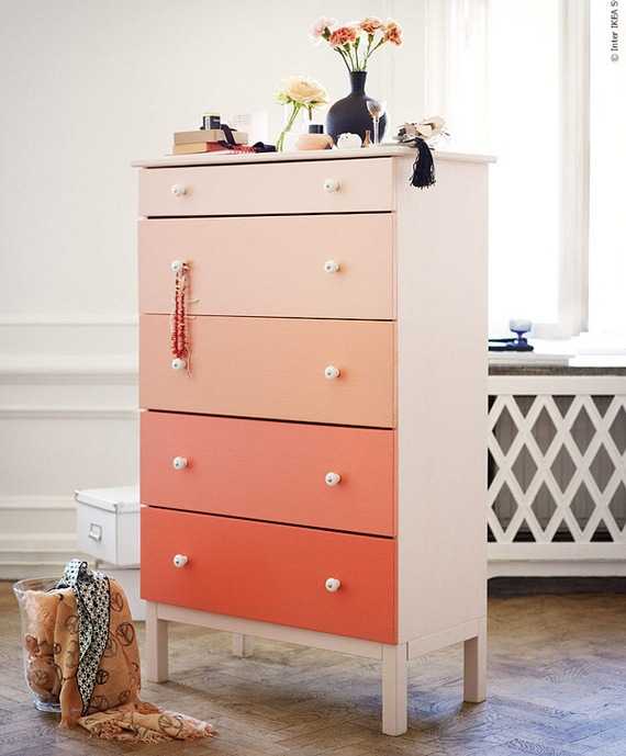 Перед декорированием комода выберите для него новый цвет. Солнечный желтый, смелый красный или свежий зеленый творят чудеса. Потом подумайте, каким образом вы хотите украсить фасады ящиков. Это может быть узор, картинка или однотонный цвет. Интересная идея — выкрасить ящики градиентом. Для этого нужно выбрать основной цвет и покрасить каждый ящик на несколько оттенков светлее предыдущего. Вдохновитесь нашей фотоподборкой!