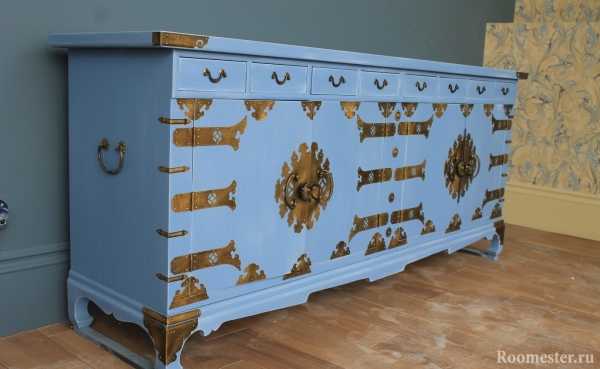 С комода снимается фурнитура, и изделие очищается. После поверхность покрывается неровным слоем шпатлевки: чем небрежнее, тем лучше. Покройте комод белой краской и разметьте скотчем зоны для окрашивания. Разведите алую и синюю краски. Пятнистость, которая может появиться в процессе окрашивания, – только плюс. Столешница и бока обрабатываются наждачкой. Готовая работа покрывается топлазурью (используйте для этого губку). Идеальный тон топлазури – «орех». После вбейте декоративные мебельные гвозди и установите фурнитуру, затемненную масляной коричневой краской.