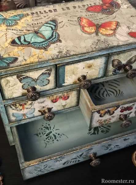 Существует множество вариантов украшения: при помощи ткани, акриловых или масляных красок, остатков обоев, бумаги, обьёмного декора. Даже если просто поменять такую мелочь, как фурнитура – приобрести в мебельном магазине интересные металлические или деревянные ручки, металлические замки с ключиками, и заменить эти мелкие детали – это может полностью изменить вид вашей мебели.