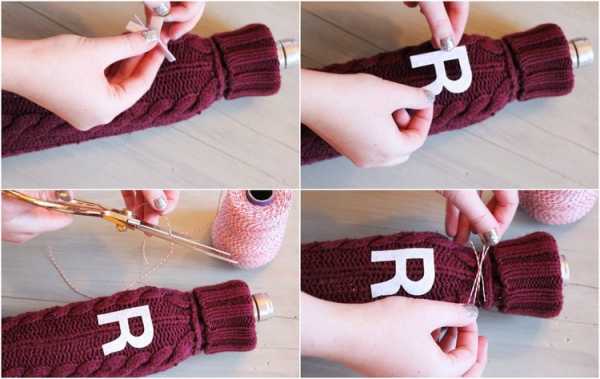 Наиболее простой способ вариант одежды для бутылки делается из рукава от ненужного свитера. Для этого просто обрежьте рукав от старой кофты. Затем сделайте затяжку в районе горлышка бутылки с помощью обычной нити. В конце пришейте дно к рукаву или заклейте его с помощью клея.