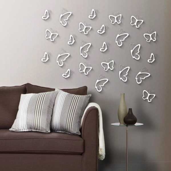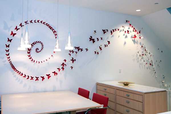 Важно! Прикрепляя бабочки к стене, можно выделить границы между определенными зонами в помещении.