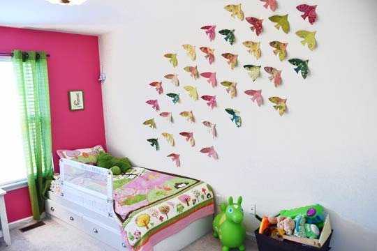 Важно! Бабочки стоит выделить на фоне стены, а для этого лучше их сделать яркими. Так они не будут сливаться с интерьером.