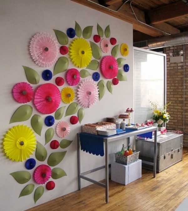 Существует много идей украшения глухих стен. Сегодня мы рассмотрим обьемный декор, сделанный из бумаги. В основном, бумажные украшения используют для оформления семейных праздников, детских комнат, спален. Чаще всего в качестве бумажного декора применяют цветы, силуэты птиц и бабочек, сердечки. Также отлично будут смотреться бумажные маски.