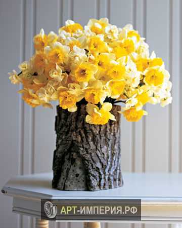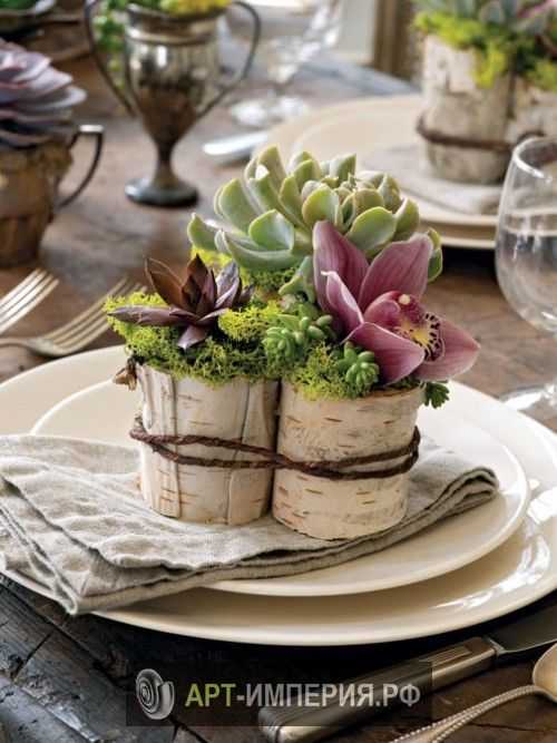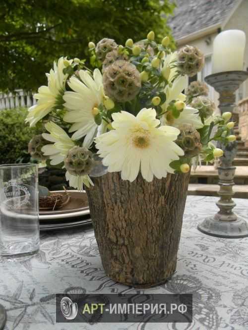 Никаких помпезных ваз. Отдаём предпочтение простым стеклянным баночкам, бутылкам, корзинкам и деревянным коробам. Их можно, к примеру, декорировать бечёвкой или кружевом.