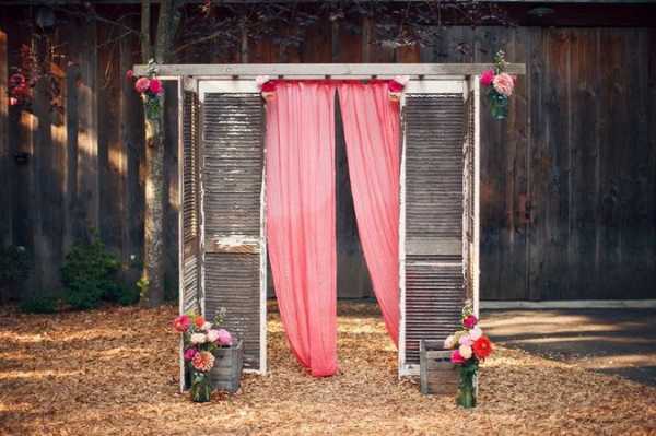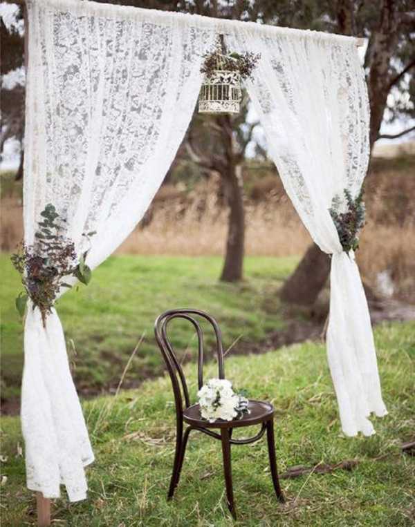 Предметы мебели создают ту основу образа рустик, которую будут видеть гости в первую очередь. Непременно стоит задуматься об арке. Она может быть выполнена из бруса, веток, украшенных мешковиной, полевыми цветами. Более оригинальным вариантом является использование в качестве арки ветвей раскидистого дерева. Его также декорируют различными элементами: драпировками, старинными кружевами и лентами.