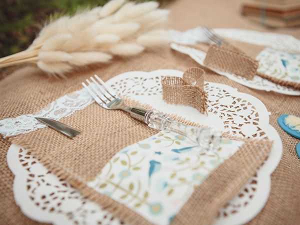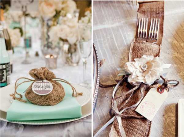 Упакуйте столовые приборы гостей в мешочек из мешковины или из крафт бумаги. Либо вожно перевязать кружевной лентой.