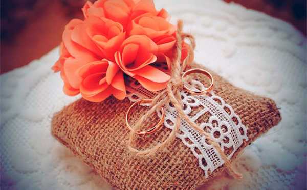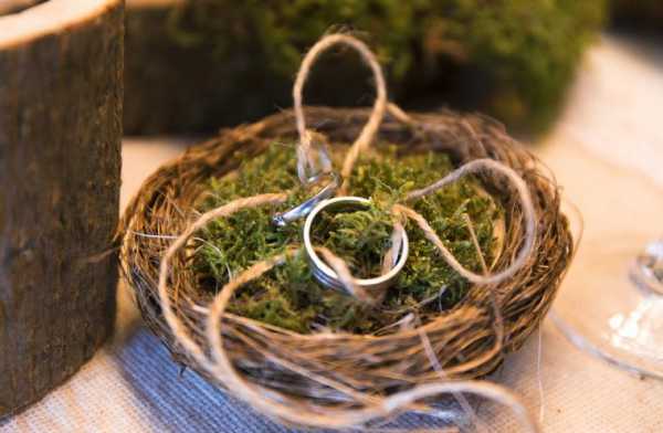 Кольца, которые обычно запечатлевают на роскошной подушке, лучше поместить в созданное своими руками маленькое птичье гнездо или сшить подобие подушечки из ситца и обрамить ее живыми цветами.