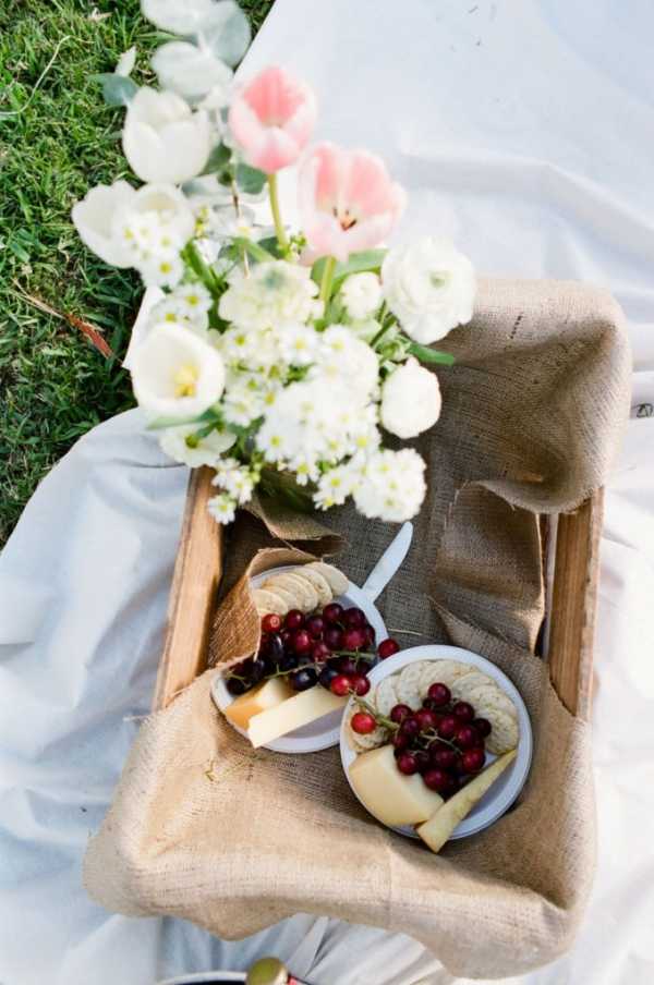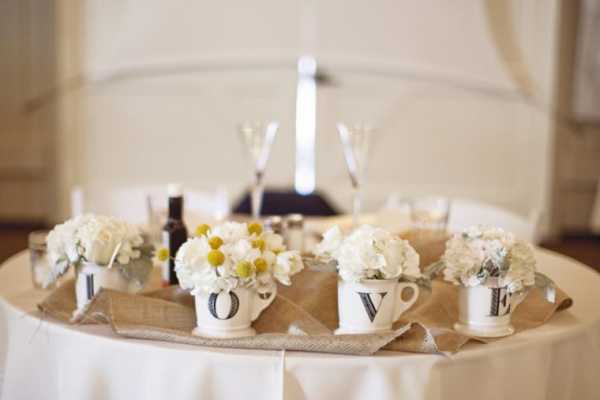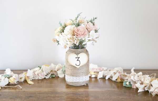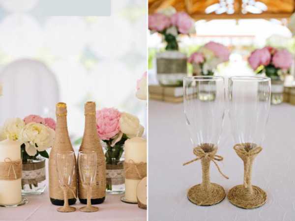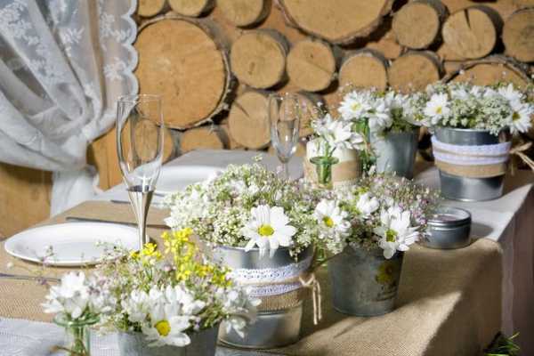 Если расставляете на столах цветы, используйте не традиционные вазы, а плетеные корзинки. Если обычную корзинку немного декорировать бечевкой и лентами, получится очень симпатичная замена вазы в стиле рустик.
