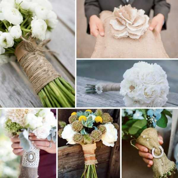 В качестве декоративных элементов все просто: для перевязки ручки букета используются ленты. Далее сверху мешковина, завязанная бечевкой или тонкой лентой старинного кружева.
