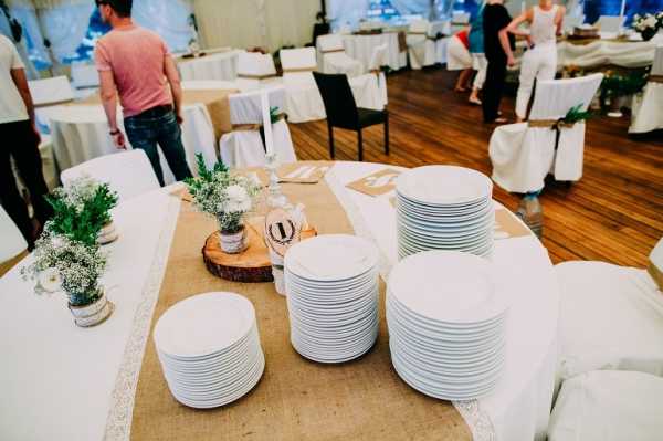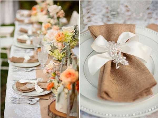 Немаловажную роль в rustic-свадьбах играет текстиль, поэтому используем мешковину, ситец и лён и кружево для оформления стульев, салфеток, столов. В основном — натуральные цвета.