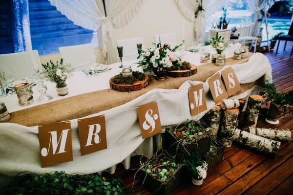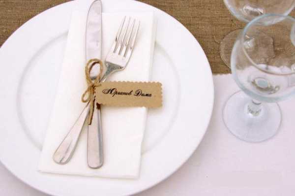 Позаботьтесь о карточках для рассадки гостей. Их можно сделать в одном стиле с приглашениями на церемонию. Для создания подойдут деревянная кора, грубая, плотная ткань, специальная крафт-бумага.