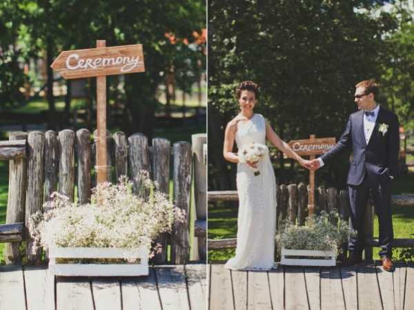 Если использовать грубо обработанные спилы дерева как указатели или украшения – это будет смотреться эффектно. Любой деревенский инвентарь сослужит вам хорошую службу и украсит вашу свадьбу.