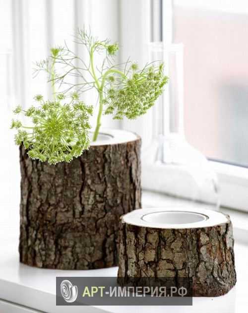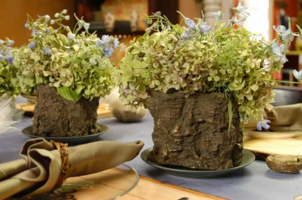 Хрустальные бокалы могут неплохо гармонировать с вазой из необработанного дерева с корой и мхом - Будет уместно изготовление своими руками не только декоративных элементов, но и украшений для невесты.