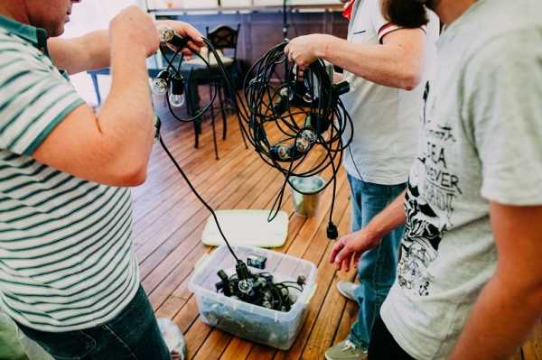 Бечевка также будет полезна. Ей можно подвязывать и крепить различные элементы, а также использовать в качестве украшения. Над столами можно повесить свечки, которые будут помещены в стеклянные подсвечники, шары из цветов, шишек и веток, праздничные гирлянды.