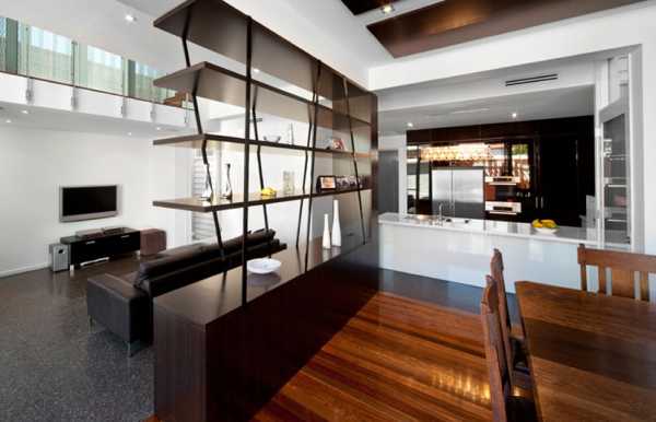 Некоторые жильцы квартир-студий, не имеющих разделения между кухней и гостиной, испытывают из-за этого некоторый дискомфорт. В таких случаях хороший вариант перегородки для зонирования комнаты – полупрозрачная матовая перегородка.