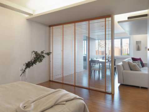 Вместо штор можно повесить жалюзи, они также легко складываются и можно регулировать «прозрачность» перегородки. Так, их можно причислить к раздвижным перегородкам, которые несложно установить своими руками.