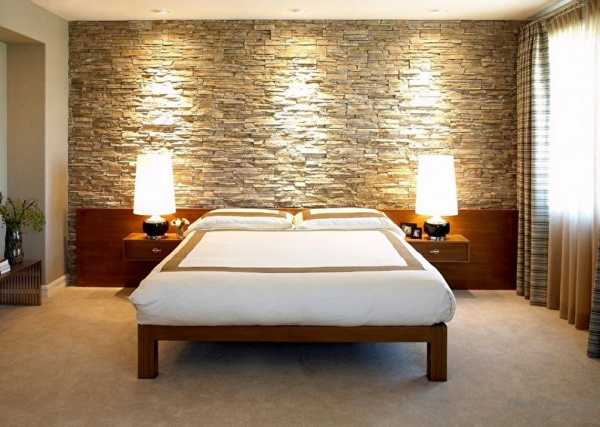 Декоративный камень в спальнеС использованием данного оформления, можно разделить спальную на определенные зоны или наоборот добиться объединения всех элементов и создания единой композиции.