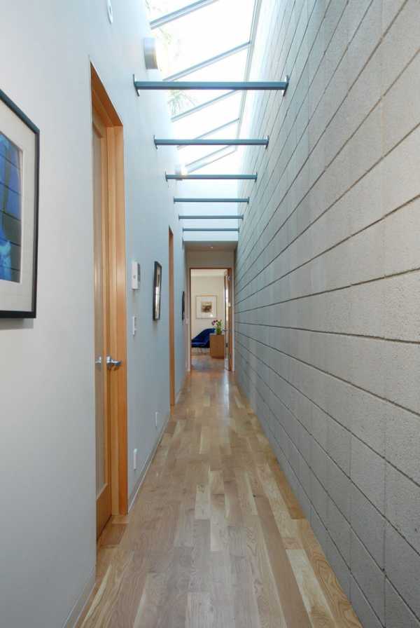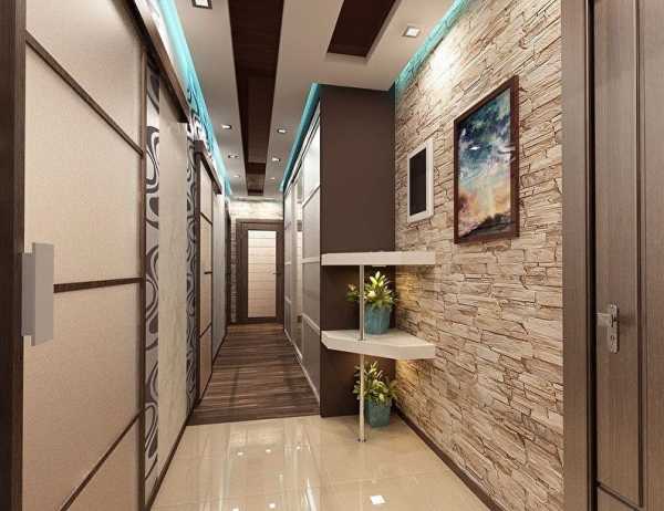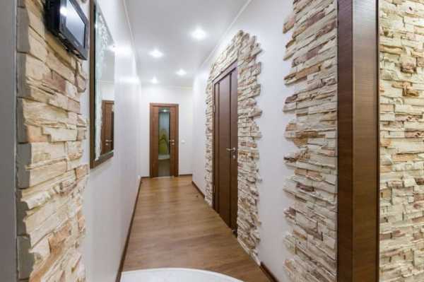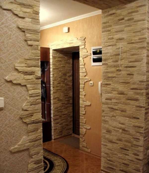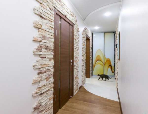 На фото интерьер коридора с дверными проемами, оформленными декоративным камнем.