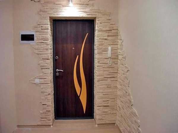 На фото интерьер прихожей и входная дверь с откосами, отделанными декоративной каменной кладкой.